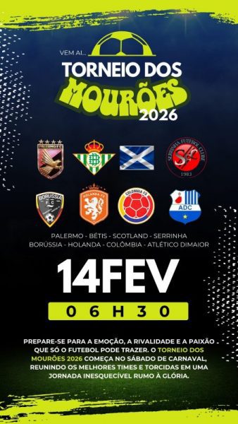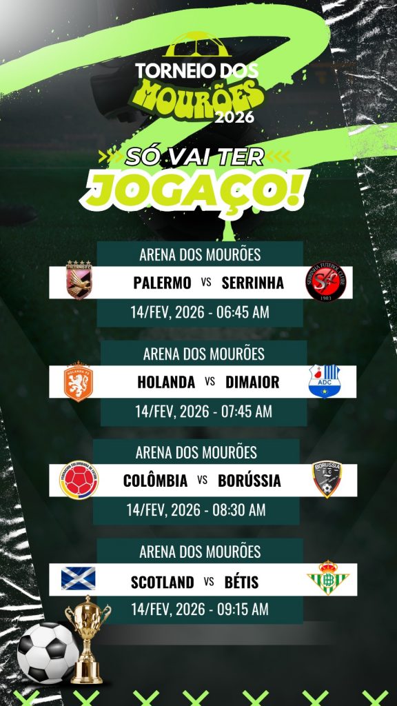 A primeira partida está prevista para às 06:30 da manha do Sábado, 14 de Fevereiro de 2026, e o Tradicional Torneio de Futebol Amador da Arena Mourões tem de tudo para ser mais uma vez sucesso total, já que um evento desse porte só ele aqui na Região.